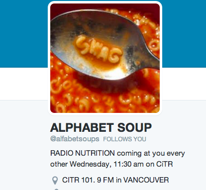 Laura Trethewey and Matthew Walsh interviewed me on CiTR 101.9 FM‘s Alphabet Soup radio show on June 11, 2014. I felt like the interview went really well, considering I have a face for radio, but a voice for silent film. Also considering that I invented a brand new pronunciation of the word “scarce!” Catch it at about the 17 minute mark.
